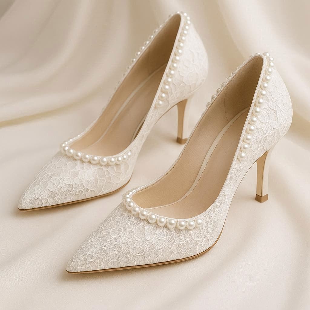 Lace & Pearl Wedding Shoes – Bridal Heels, Elegant White Dress Shoes for Ceremony